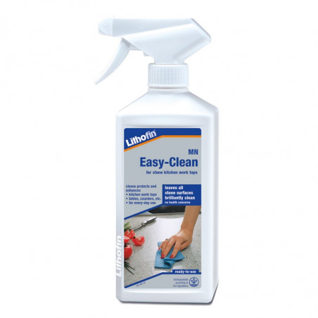 Pour le nettoyage régulier et quotidien des surfaces en pierre naturelle comme les plans de travail de cuisine, les tables et la salle de bains. Particulièrement approprié au marbre et à la pierre calcaire. Convient également aux surfaces en céramique, en verre et en matériaux synthétiques. Idéal pour un nettoyage rapide. Remarque : sur les surfaces imprégnées avec Lithofin Fleckstop, Lithofin MN Easy-Clean conserve et soutient l'effet de protection.
