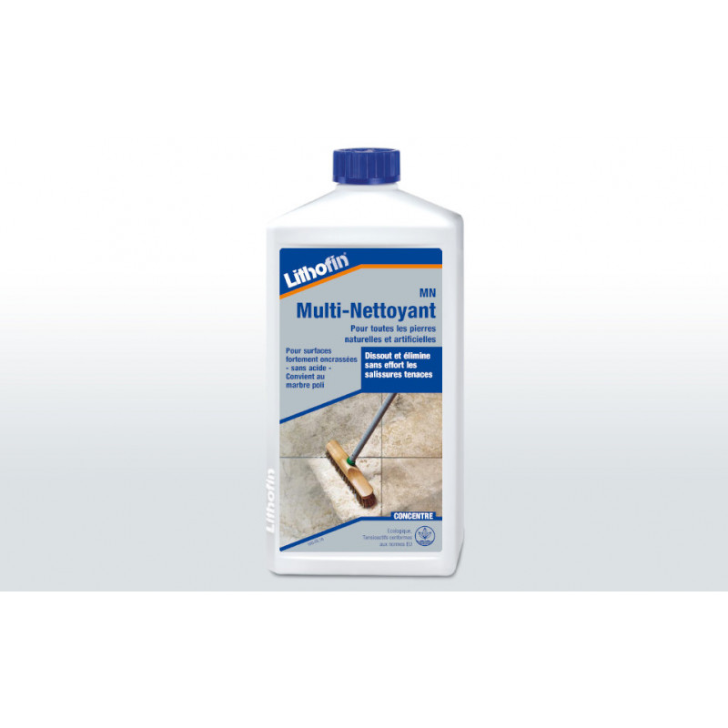 Lithofin MN Multi-Nettoyant dissout et élimine la saleté grasse et huileuse, les pellicules brillantes, les résidus de produits d’entretien pour sols, les pellicules minces de cire et les salissures courantes.